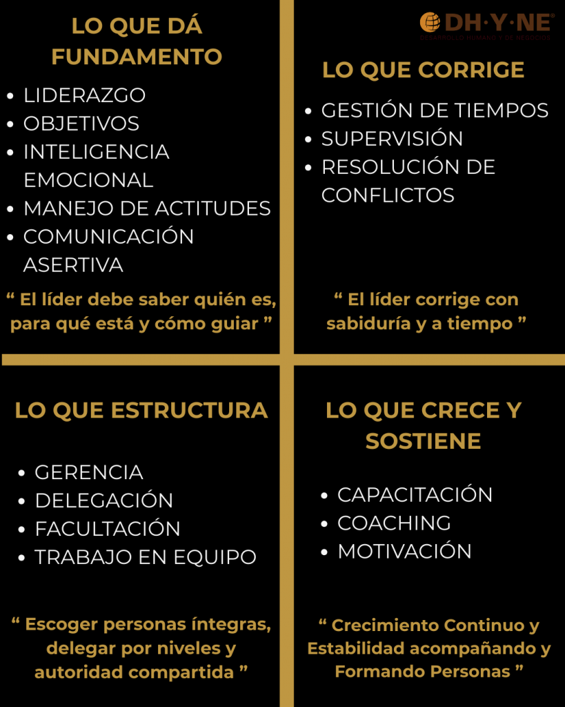 * Coaching: Se enseña a acompañar, guiar y potenciar el desarrollo de cada colaborador, ayudándoles a descubrir sus fortalezas y mejorar áreas de oportunidad.
